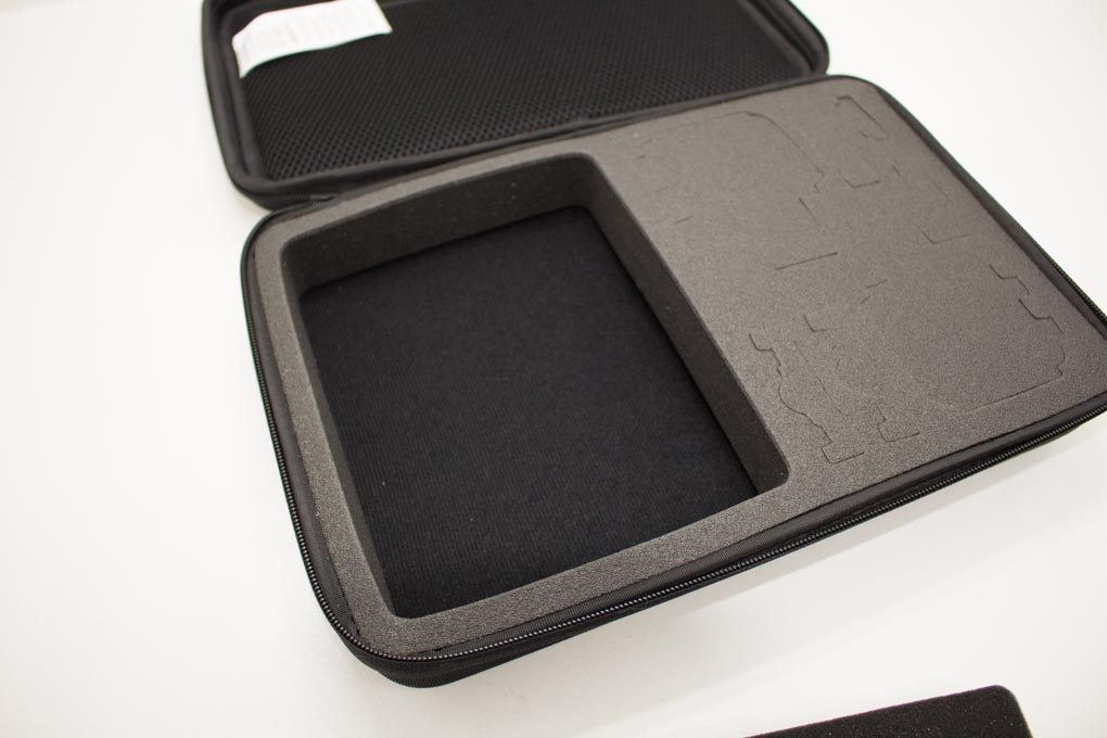 Inside, the case has a lid that opens to reveal an elastic mesh compartment that will allow you easily store and retrieve your various cables, small accessories, and quick reference guides. The rest of the case is 1 and 1/4 inch thick EVA foam with pre-cut slots. Only three of the available slots are easy to identify, two for GoPros and one for accessories. The other five slots are for .. um .. maybe .. well… whatever fits I guess.