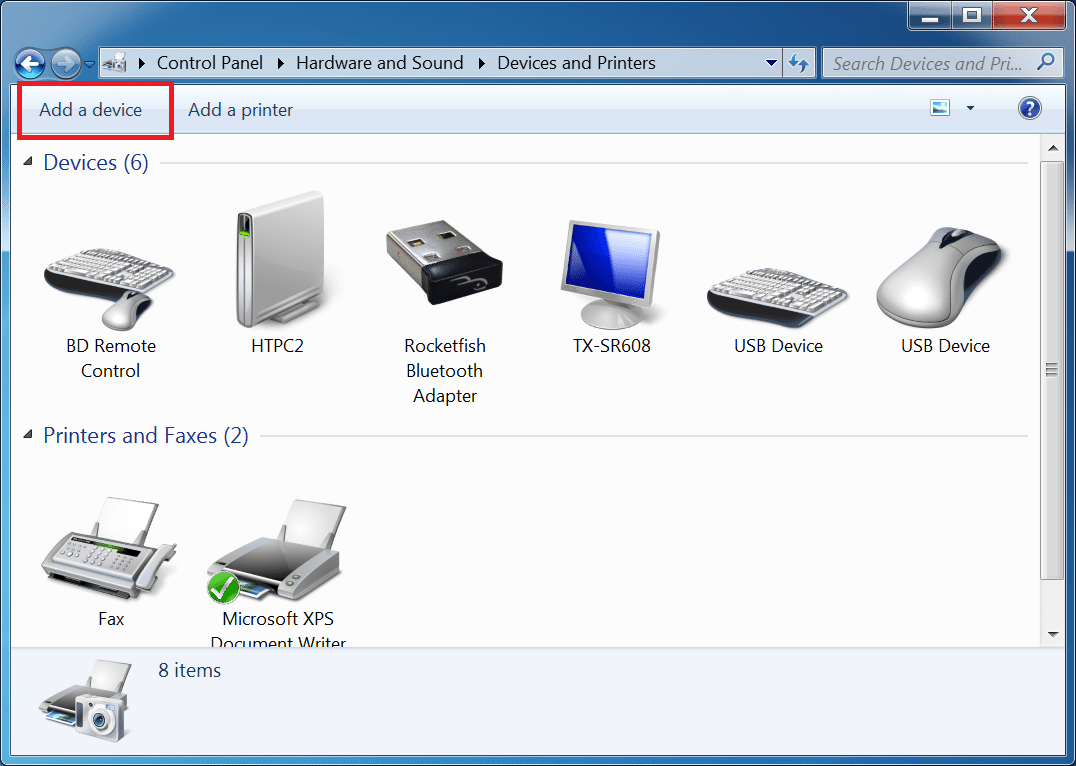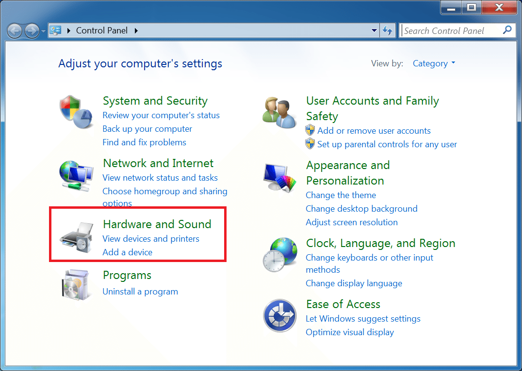 - Once in the Control Panel, Select Hardware and Sound, then Devices and Printers