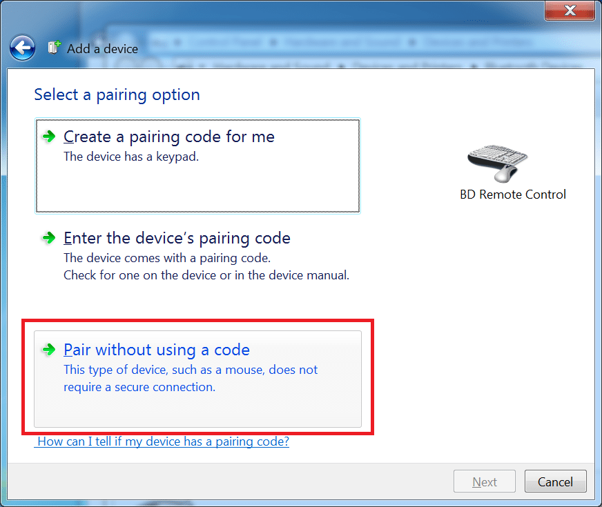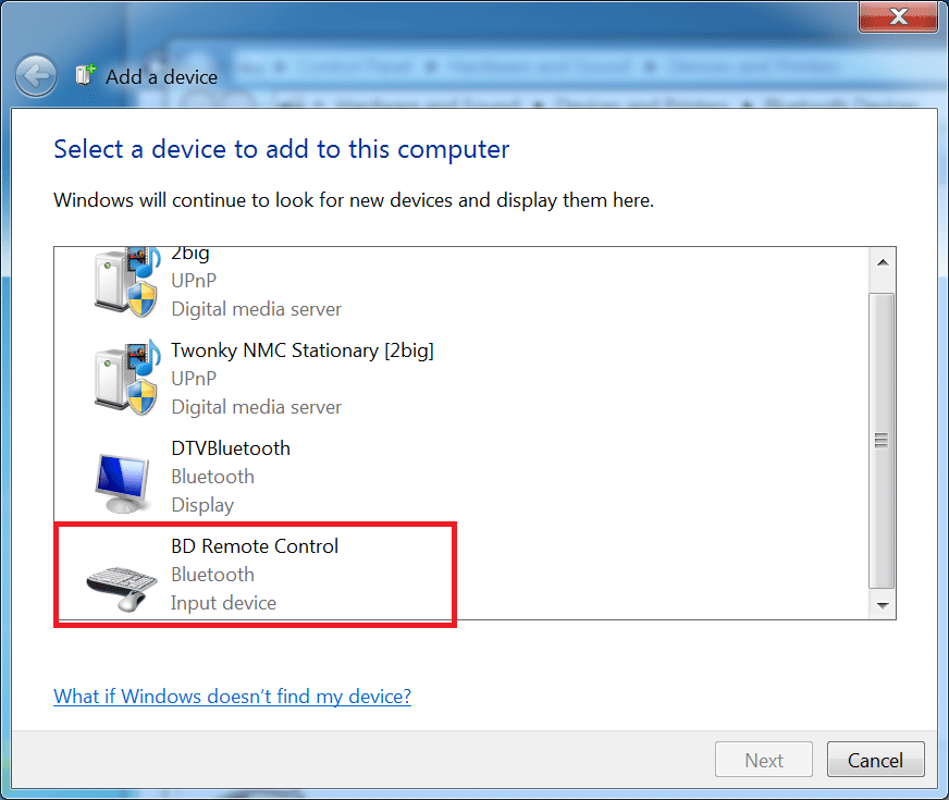 - You will know the device is in pairing mode when it shows up in the list of devices. It will be represented under Select a device to add to this computer as BD Remote Control
