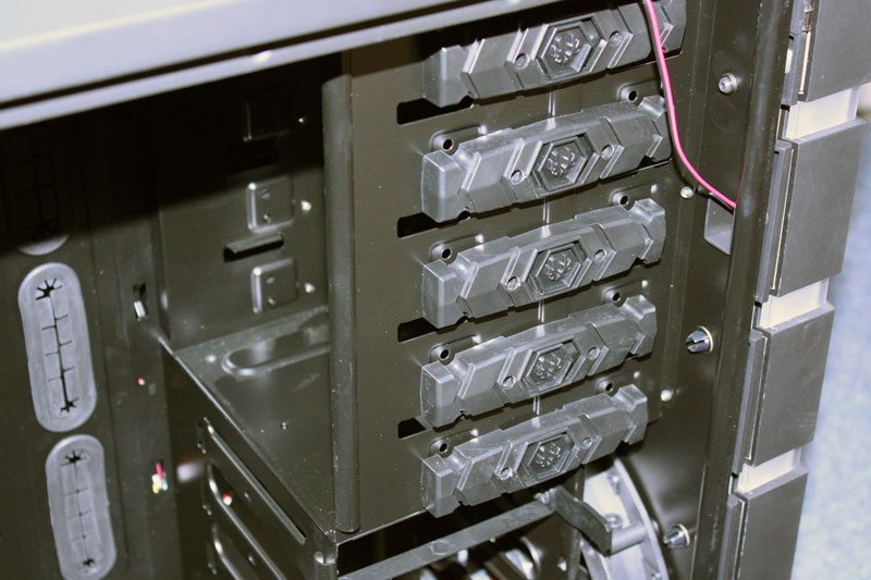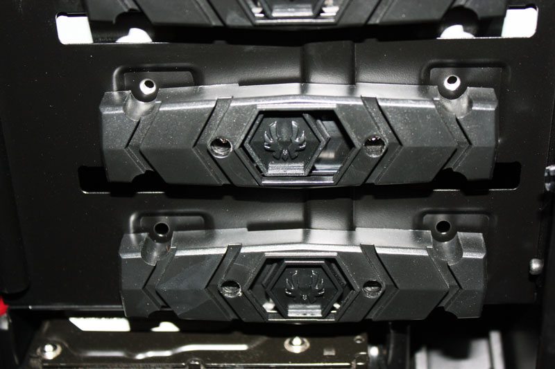 The 5.25″ rack at the top features a unique design that is pretty clever. Each of the bays are completely tool free and use a mechanism that seems like it was featured on a medieval weapon. There is a button in the middle that will slide to either side when pressed that either releases your bay device or locks it in place out of shear fear. Each of the installed devices are free from wiggle and the design allows for extra piece of mind by providing the ability to further secure your drives with a screw… if you are paranoid.