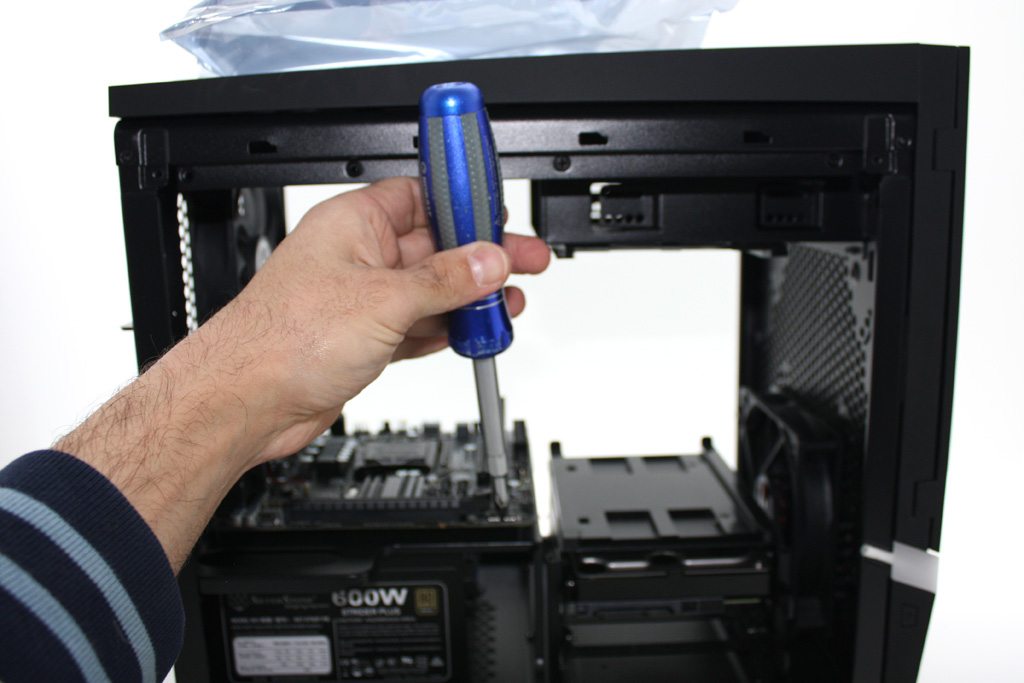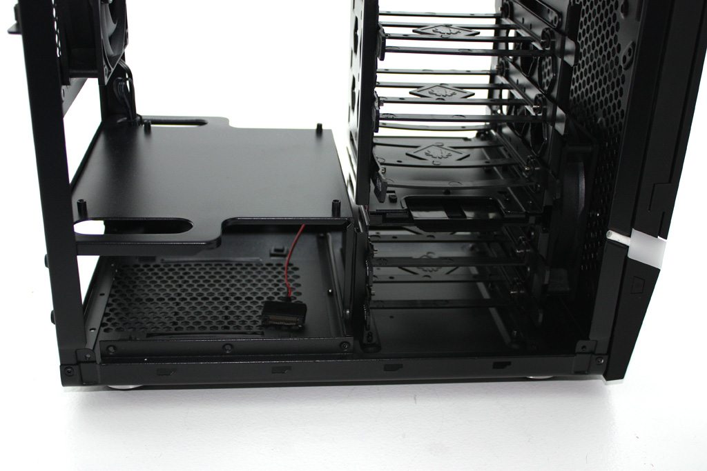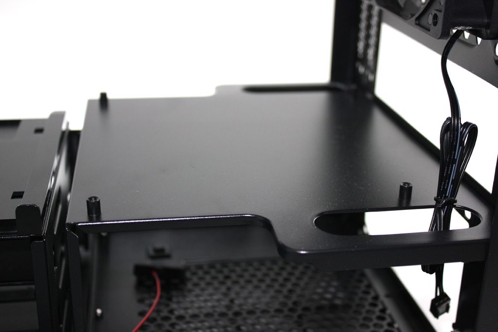 When it comes to the motherboard, it doesn’t rest on the bottom of the case or on the side like a traditional ATX case. Instead, it sits above your PSU on a motherboard tray with wiring cutouts on either side. This tray not only acts as the motherboard installation point but it also provides an installation point for two vertically mounted 2.5″ drives (when the HDD racks are removed). Using a full sized screwdriver is not an option.