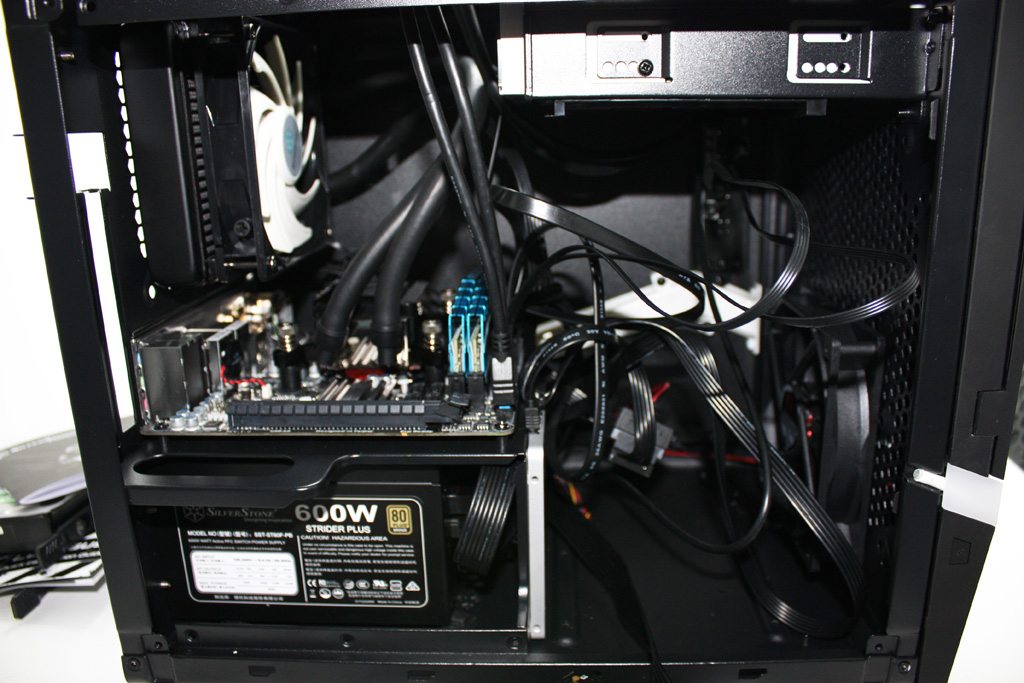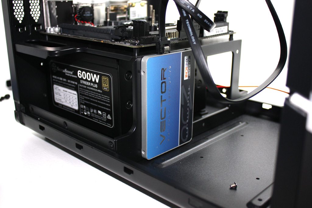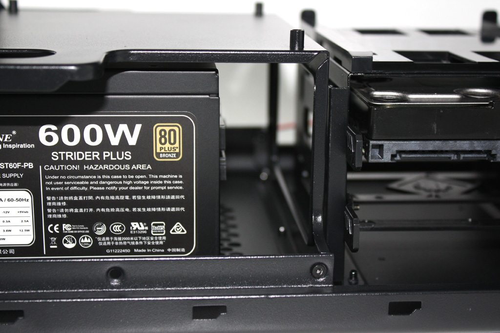 Unfortunately, there isn’t much room to work with when it comes to your PSU. There is a rear mounted plate for installing your power supply (in either direction) and when a 2.5″ drive or the HDD rack is installed, things get very tight. Total space is about an inch. Better get a modular PSU.