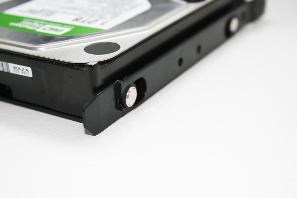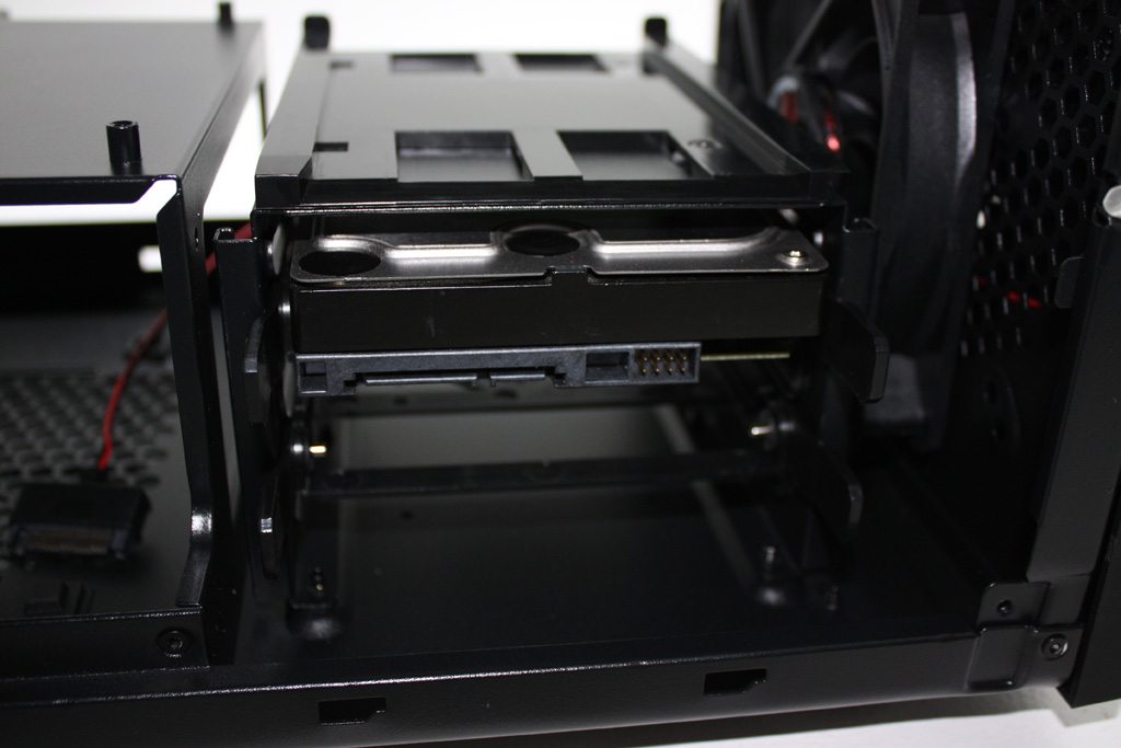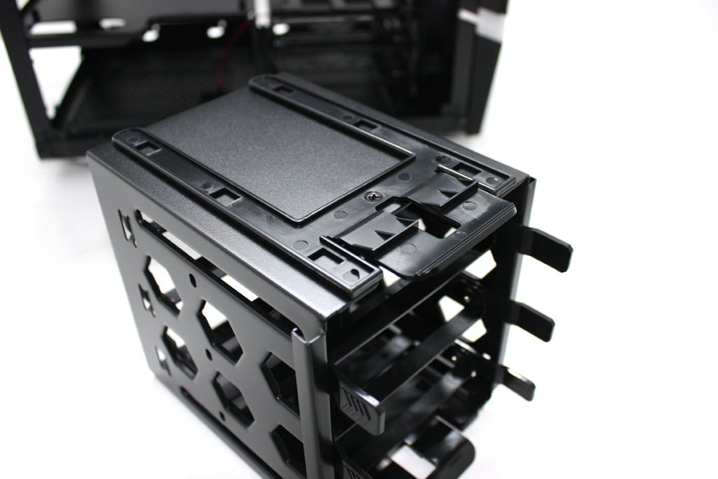 When opening the chassis, you are immediately presented with plenty of storage options. There are two drive cages that hold a total of five drives. The larger of the two drive cages can accommodate three 3.5″ or 2.5″ drives. The cage rests on plastic rails and can be removed easily by way of two clips for systems with large video cards. The drives are installed in plastic tool free trays that slide and lock into place. For 3.5″ drives metal standoffs are inserted into the sides of the HDD for a very snug fit. 2.5″ drives are screwed in place from the bottom.
