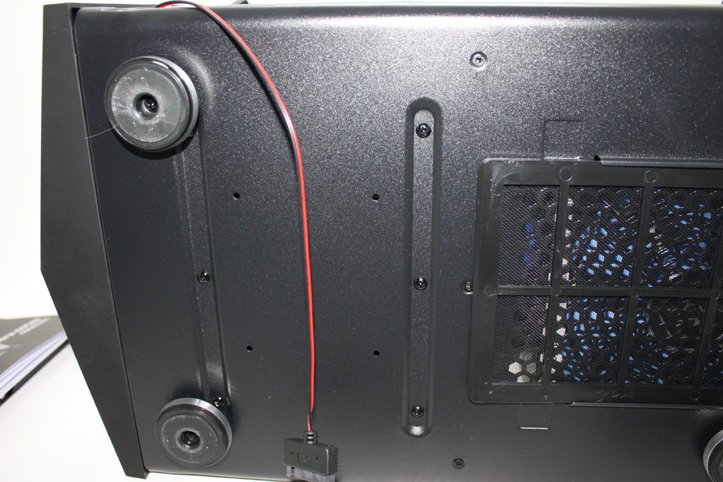 The bottom cage can house 2 drives. The drives are installed in the same drive trays. Although this cage is removable, the process isn’t exactly as tool free and easy as removing the top cage. Instead, you have to flip the case on its side, remove the two front stereo styled feet, and then remove the six screws that hold it in place. Personally, I don’t see many scenarios where removing this cage is a necessity… it is more of a convenience thing. I removed it for a reservoir. Just below the cage are four screw holes for a 2.5″ drive.