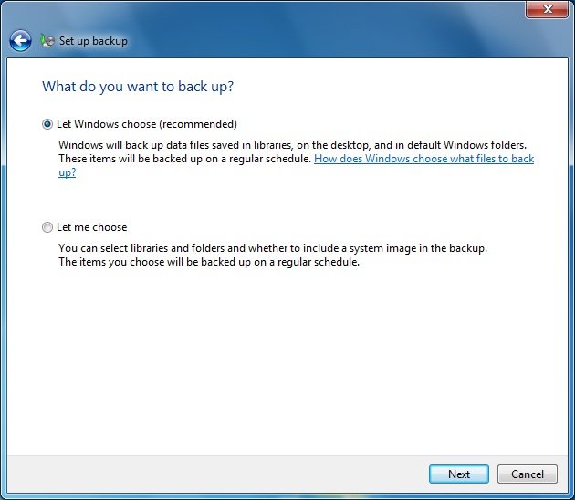 If you are less adventurous you can let Windows decide what to backup, however, I prefer to have a little more control over what gets done. Select Let me choose and click Next.