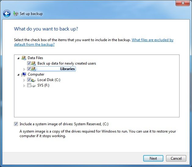 I am of the opinion that a system image is the way to go instead of just backing up personal data. If a software disaster were to occur, it is a royal pain in the patootie to reinstall your OS, your applications, and configure all of your settings again. A system image allows you to restore your system back to an operating state with all of your applications, settings, and files as if nothing had ever happened. The only thing you need to be sure of is that you are restoring an “uninfected” backup should your issues be a result of some malicious software. If you should choose not to run a backup using the System Image option, you can run this system image type backup at any time from the main backup and restore screen on an “as needed” basis.