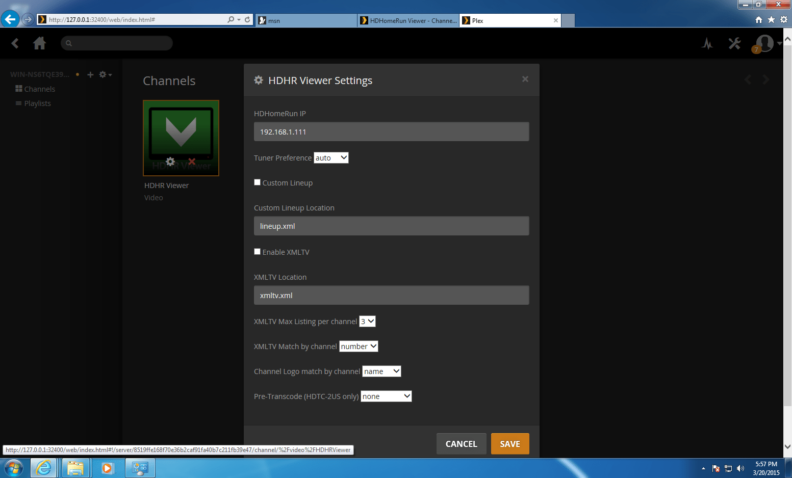 Once Plex has been restarted simply Launch the Plex Media Server Media Manager. The HDHR Viewer will be listed under Channels. Just hover and click the gear icon to display the HDHR Viewer Settings. Enter the IP address of your HDHomeRun device into the HDHomeRun IP setting, and click Save and enjoy.