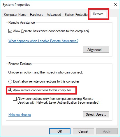 - Choose the radio button for Allow remote connections to this computer
