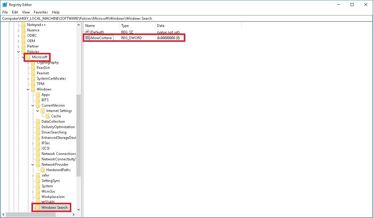 - Type AllowCortana and set its Value to 0 (zero)