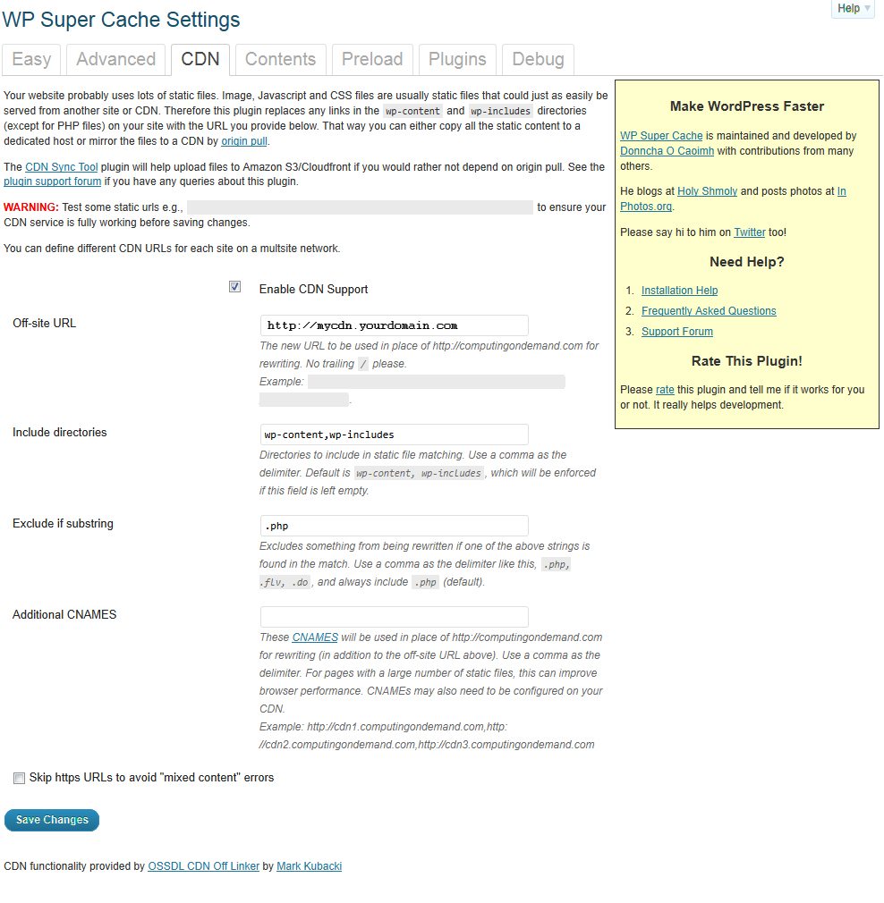 Once all that is finished, you can configure WP Super Cache and WordPress to use your new CDN.