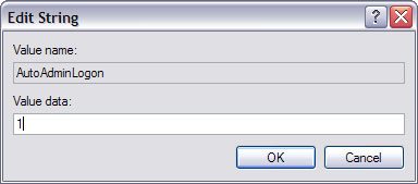 5. Double-click the AutoAdminLogon entry, type 1 in the Value Data box, and then click OK.