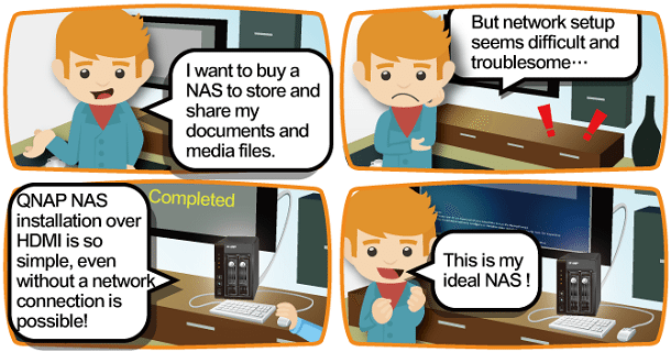 Users can now conveniently and locally set up their Turbo NAS without a network connection. By connecting a keyboard, mouse and HDMI monitor to the Turbo NAS, you can install the NAS in just a few clicks. Please forgive the graphic display of joy below …