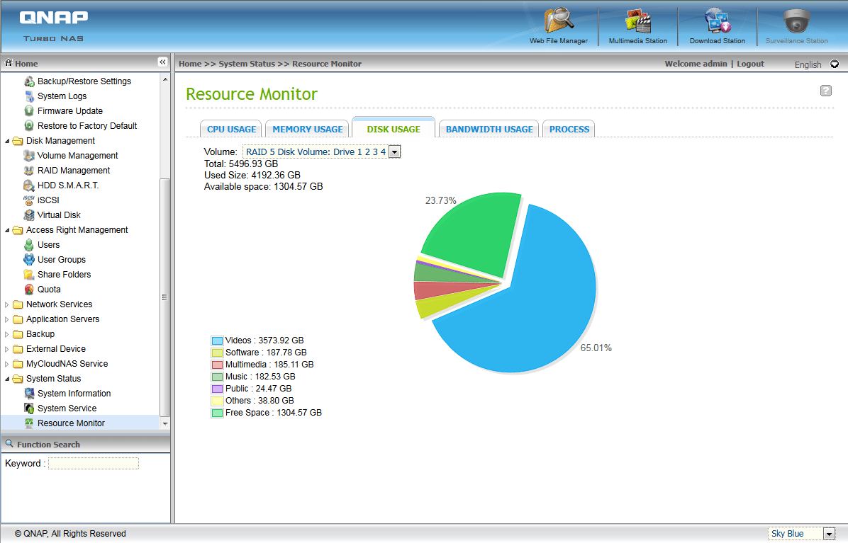 For testing the transfer speed of the NAS we really didn’t do anything fancy. Our benchmark was transferring a 46.6GB Blu-Ray ISO (Avatar) from the TS-419P+ to our workstation. We just initiated the file transfer and watched the networking tab in Windows Task Manager and the Bandwidth Usage Tab in the Resource Monitor for the TS-419P+. We experienced around a 34 MB/s transfer for the duration of the test but also noticed that the CPU in the NAS was steadily near 100% usage. This could potentially add up to some lag if you have multiple applications running on the NAS and transferring large files around.