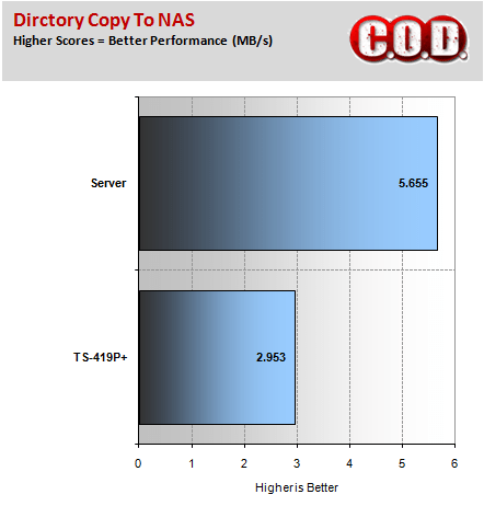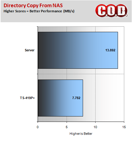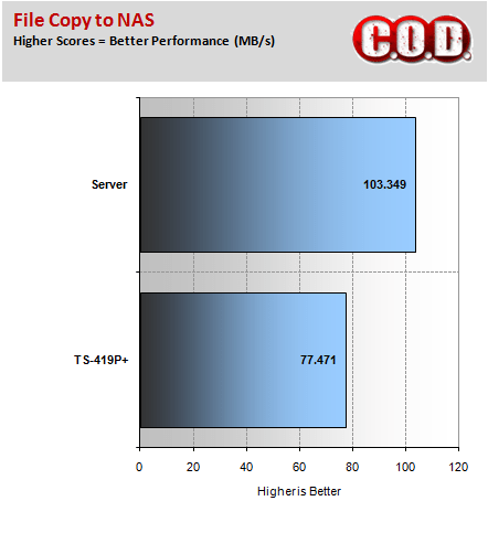 Further testing with Intel’s NAS Performance Toolkit demonstrated that the TS-419P+ still lagged behind our in house custom server, even though it was fitted with faster hard drives.