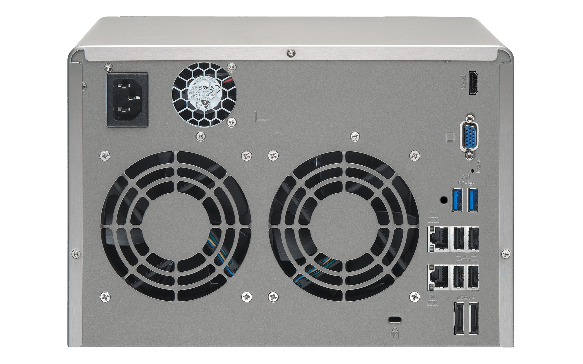 Around back the TS-669 PRO features the Power Supply unit, two USB 3.0 ports, four USB 2.0 ports, two eSATA ports, two 90mm cooling fans, a VGA port for maintenance, the K-Lock Security Slot, and the Password & Network Settings Reset Button.