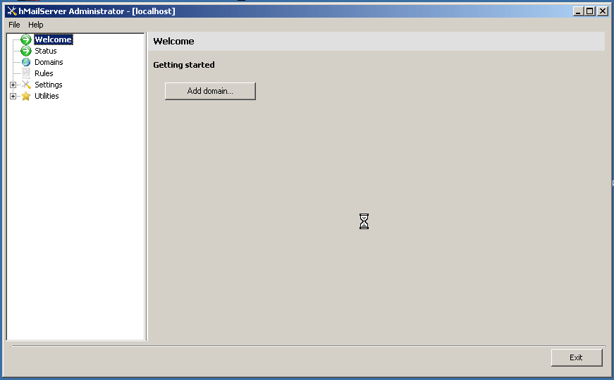 From the Welcome Screen you can see how the application is setup.  There is a tree on the left with the configuration hierarchy with the configurable options on the right.  At first start, hMailServer will place you under “Welcome” and the only available option is to create a domain.