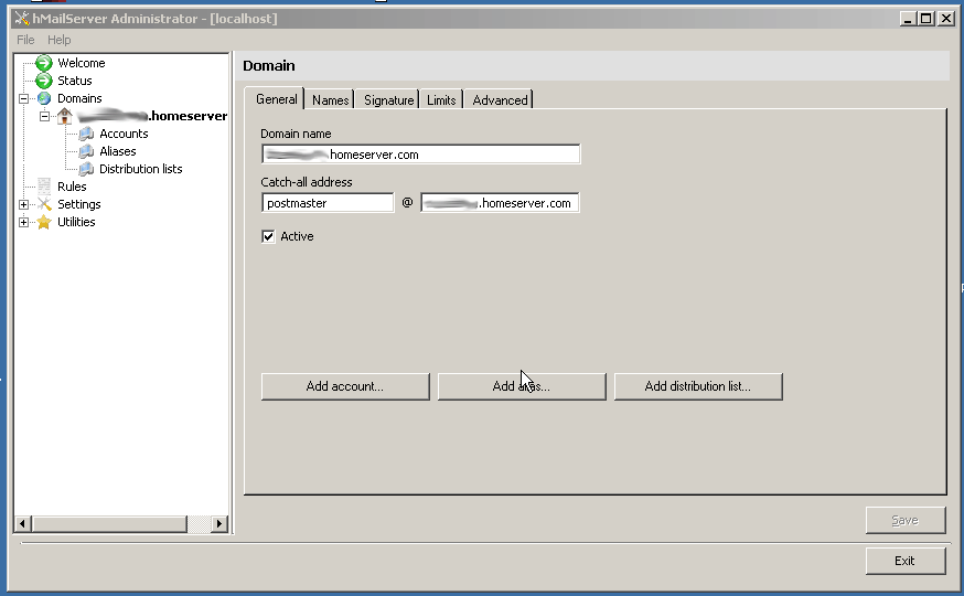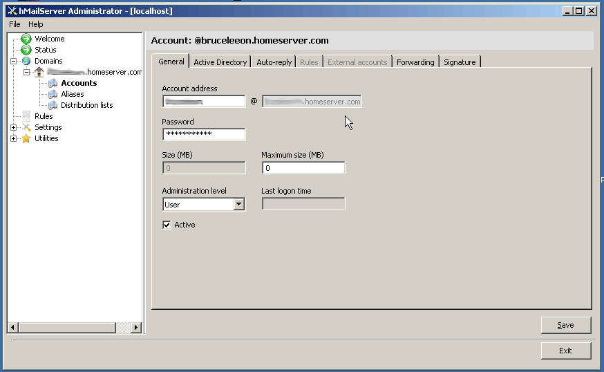 For a basic configuration, I wouldn’t really worry about configuring any of the options in the tabs that become available in this screen.  This is a simple installation and configuration tutorial; further experimentation is recommended for your configuration.  You are now able to add your first account to your hMailServer.
