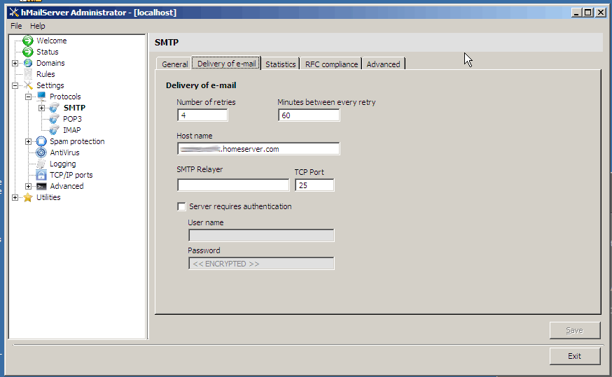 - Click the Delivery of Email tab and populate the Host Name with the address of your WHS. It is essential that this be completed so that the mail server knows its public name.