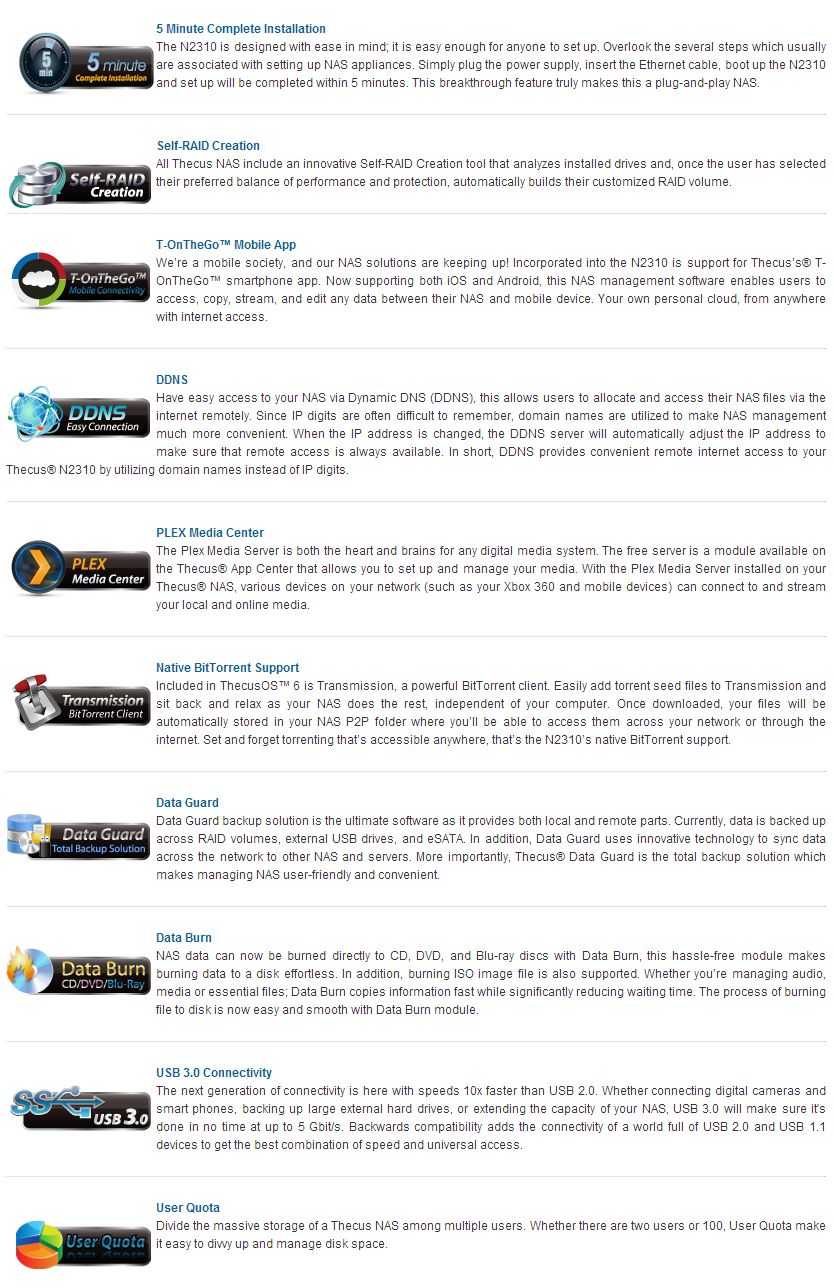 The N2310 runs Thecus NAS OS6 and provides many of the features and functionality found in much more expensive options. Thecus NAS OS6 brings things like Web-based file access, FTP server, BitTorrent clients, Plex, Mobile Apps, Self RAID creation, and plenty of modules to extend features even further.