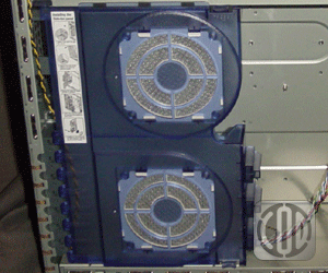 Now, let’s get to the meat of the sandwich, the internals. Let me warn you up front, this case is busy. The first thing you see when you pull off your side panel is another door that carries your two side panel fans. Although it seems like overkill it’s not because when you take your side panel off, the last thing you want to have to do is disconnect your fans so you can put the panel somewhere out of the way. This thing is clear blue plastic held in place by those little bumps and some press locks. Once again you are given your nice removable washable filters for those of us with cats. There is something really fishy things going on here though; like fan sizes. These fans in the side panel and the back are 90x90x25. Doesn’t that seem weird to you? Standard sizes are 80mm, 92mm, and 120mm; now what would ever drive Tt to use 90mm fans? (I can take a few guesses)