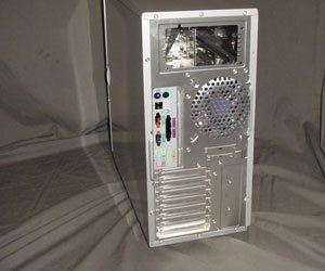 The side and back of the case is standard fare, with a few exceptions. The side panel has your standard Tt adorned X window. The method for opening it has changed slightly though, thanks. No longer are you bothered with an obtrusive handle, now you are given two subtle handles. Tt also decided to add some pizzazz (yeah, I said pizzazz) to the 90mm side panel fan by giving it a nice mesh fan guard. Why on earth they use 90mm fans is beyond me, but Tt seems to be making a habit of it. In the rear of the case you are greeted with standard gear but instead of going with a smaller, louder fan, Tt included a Blue LED 120x120x25 mm fan spinning at 2000rpm. It seems that these larger fans are becoming more popular as they push more air nearly completely silent and making this one an LED fan is a nice little touch. As with the intake fan, it requires no screws to remove it, but you are limited again with your fan replacements.
