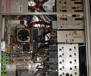 All the drives are installed and I go to put the rack in place inside the case and… WOW. That is tight. There is about ¼ inch between the drives and my video card. That makes for a big headache for a couple of reasons. If I want to hook these drives up, I have to remove my video card. What a pain in the ass. If Tt had only made this case ½ inch longer there would be no problems here. This means that I couldn’t use rounded cables, and if Tt hadn’t given me enough room between the drives to shove the ribbon cable in there, I would not have been able to use the second designated HDD mounting area in the rack at all! Not only is this a pain in the ass, but it also restricts airflow throughout the case. Like I said, this is the case’s best and worst feature.