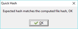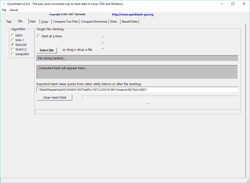 Once NOOBS is downloaded, kick the process off with validating its hash. Do this by opening Quick Hash, switching to the File Tab, selecting SHA256 and copying the SHA-256 for NOOBS on the download page to the field for “Expected Hash Value”, then selecting the NOOBS download with the “Select File” button. If all goes well, you will see the file being analyzed and then a notice “Expected hash matches the computed file hash, OK”.