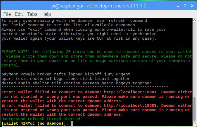 Once the wallet is created, the application will ask for the language you want your seed in. When you make your selection, you will be prompted with a number of warnings about the daemon failing to connect… this is normal as we do not have our Pi connected to the internet or any network. Write down your mnenoic seed for safe keeping. DO NOT SHARE THIS WITH ANYONE, they can recreate your wallet with it.