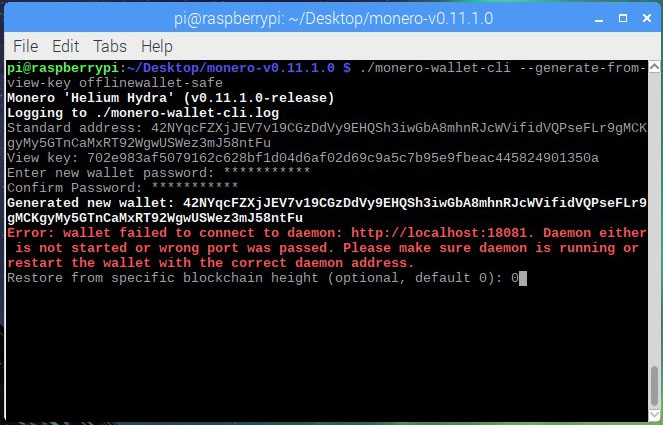 1. FYI, I’m trying this on a Pi Zero without wifi and it does not work. The Pi Zero has an ARMv6 processor and will not run the monero-wallet-cli without ‘illegal instruction’ error. It appears I’m going to have to compile on the Pi which will require a lot of dependencies that will be tricky to resolve without any networking!
