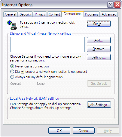 From Internet Explorer (I have version 6 on this laptop so that is what you will see), expand the Tools menu and select Internet Options. When the window opens select Lan Settings towards the bottom of the screen.