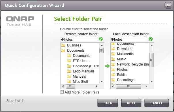 Step 4 of 11: Hitting the Next button will bring you to a screen that wants you to select your Folder Pairs. The left side of the screen represents your FTP Server’s folder structure and the right side is your QNAP’s folder structure. We are only going to show you one folder pair in our example, but if you select the box at the bottom of the Wizard screen you can add more than one folder pair. When you have all your folder pairs setup the way you want.