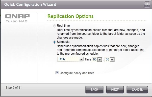 Step 6 of 11: This next step will be for you to choose between real-time replication or replication based on a schedule. For this, this is personal preference; I prefer to have this done at off-peak hours, so I would choose Schedule and pick a time like midnight. You will want to check the box for Configure policy and filter then hit Next.