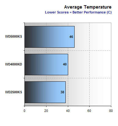 The WD5000KS lives under the Western Digital “Cool n’ Quiet” roof and actually lives up to these claims somewhat better than I had expected. Under conditions here in the lab, this drive is in open air. It does not receive any cooling from case fans and because of that, it is usually very easy to hear the drive during testing however, this drive remained nearly inaudible throughout testing.